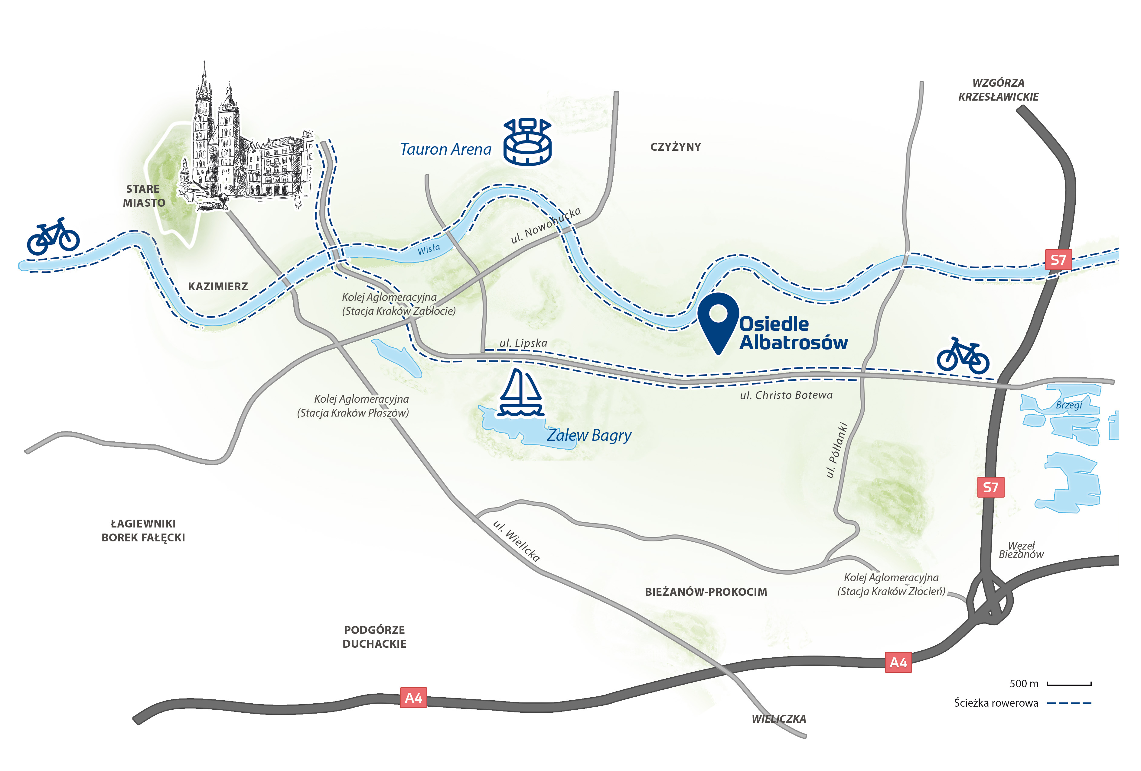 Dobrze rozwinięta infrastruktura drogowa umożliwia także sprawny wyjazd z miasta – droga ekspresowa S7 oraz powstająca Północna Obwodnica Krakowa (węzeł Przewóz) znajdują się zaledwie 3 km od osiedla.